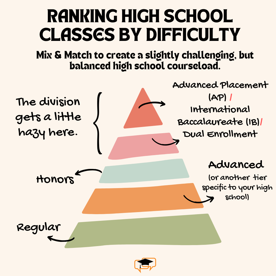 But with all that said, it’s important to be aware of your time and energy constraints. Most students have extracurriculars that occupy significant amounts of their time, so adding in several rigorous classes could be the perfect recipe for overwhelm.
